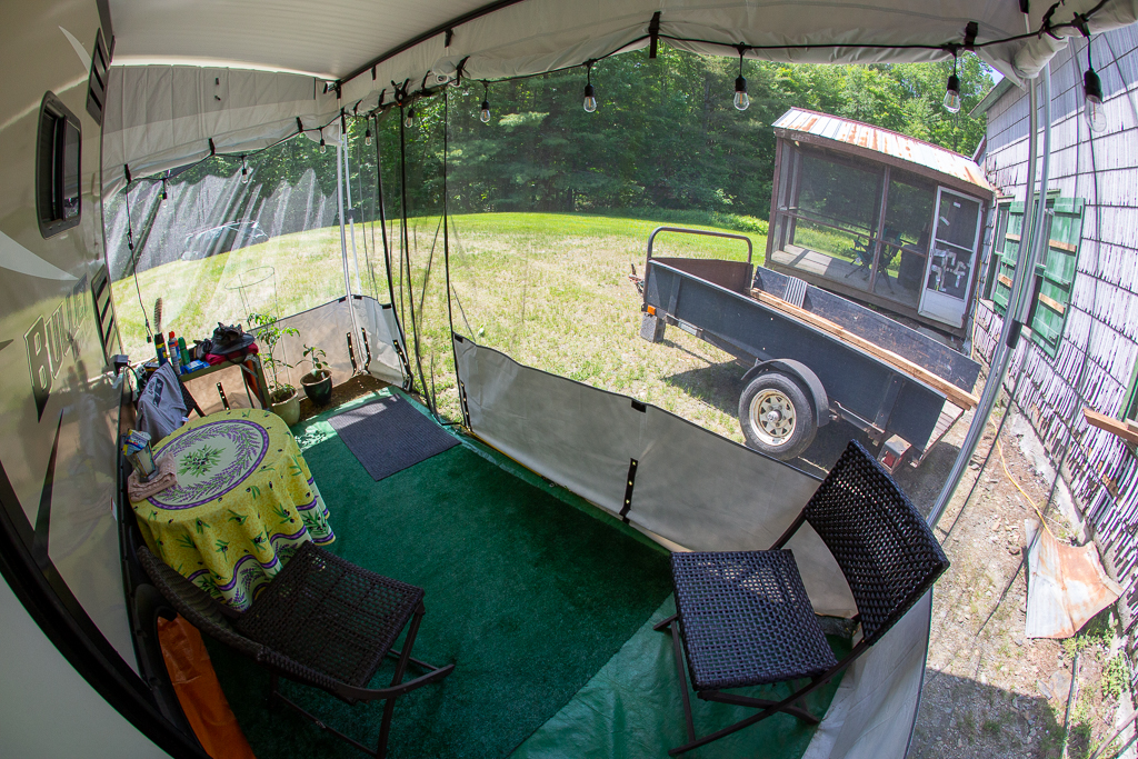 We haul in a screened veranda addition to the RV in hopes it will expand living space, help reduce what gets tracked inside the RV, and deter flying insects such as the swarm of mosquitos happily breeding in the standing water covering the cellar floor. They may be seasonal, but the black flies are a real annoyance and we need all the help we can get dealing with their swarms.