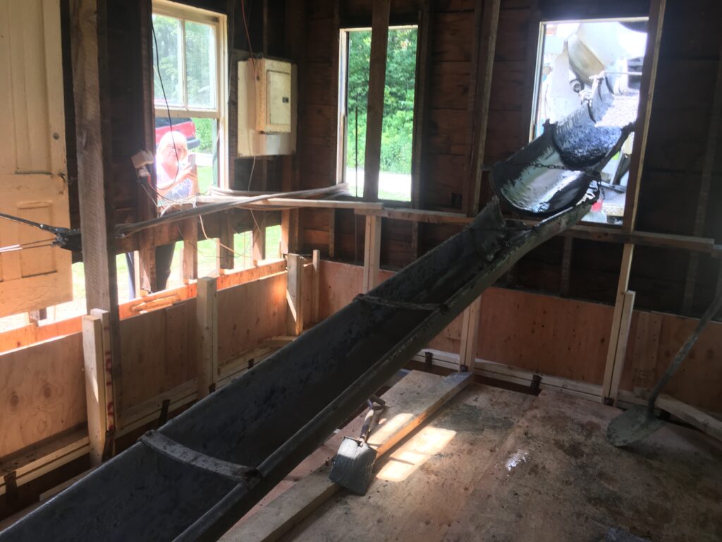 We start building the form in late July and by the first week in August we’re ready for concrete. Due to the irregularity of the stone walls, it’s impossible to estimate the amount of concrete we will need. A friend of our builder who has built concrete foundations, walls, basements, etc. stops by to help determine how much concrete we should order. He says the form is solid and he can’t imagine what more could be done to hold back the extreme pressure created by the yards of concrete, but we’re still nervous. He also tells us about a job he worked once where a one-sided form like ours popped up unexpectedly when the concrete was poured which allowed it to run beneath the bottom of the form and halt the project. The next day we add vertical boards and secure the ends to the remaining second floor joists.